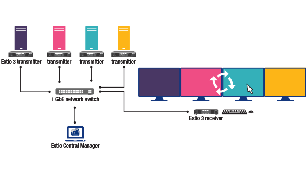 Extio 3 lets operators view and control up to four source computers from any receiver unit using a single keyboard and mouse. Effortlessly switch control between systems by moving your mouse across a multi-screen desktop.